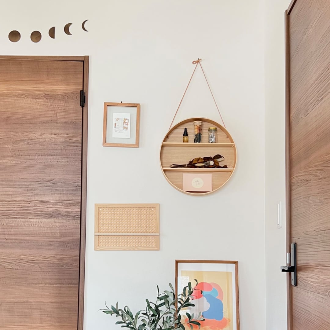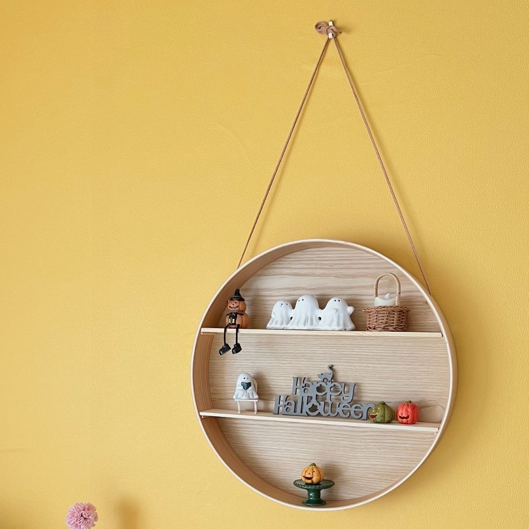 ■この飾り棚の特長は、暖かなデザインと日本のコンパクトな住居にも合う直径39cmという大きさで幅の狭い壁でも余白を作ることができます。どんなインテリアスタイルにも馴染み、お部屋の雰囲気を引き立てます。さらに、壁掛けの皮紐はベージュで柔らかい雰囲気を演出します。
