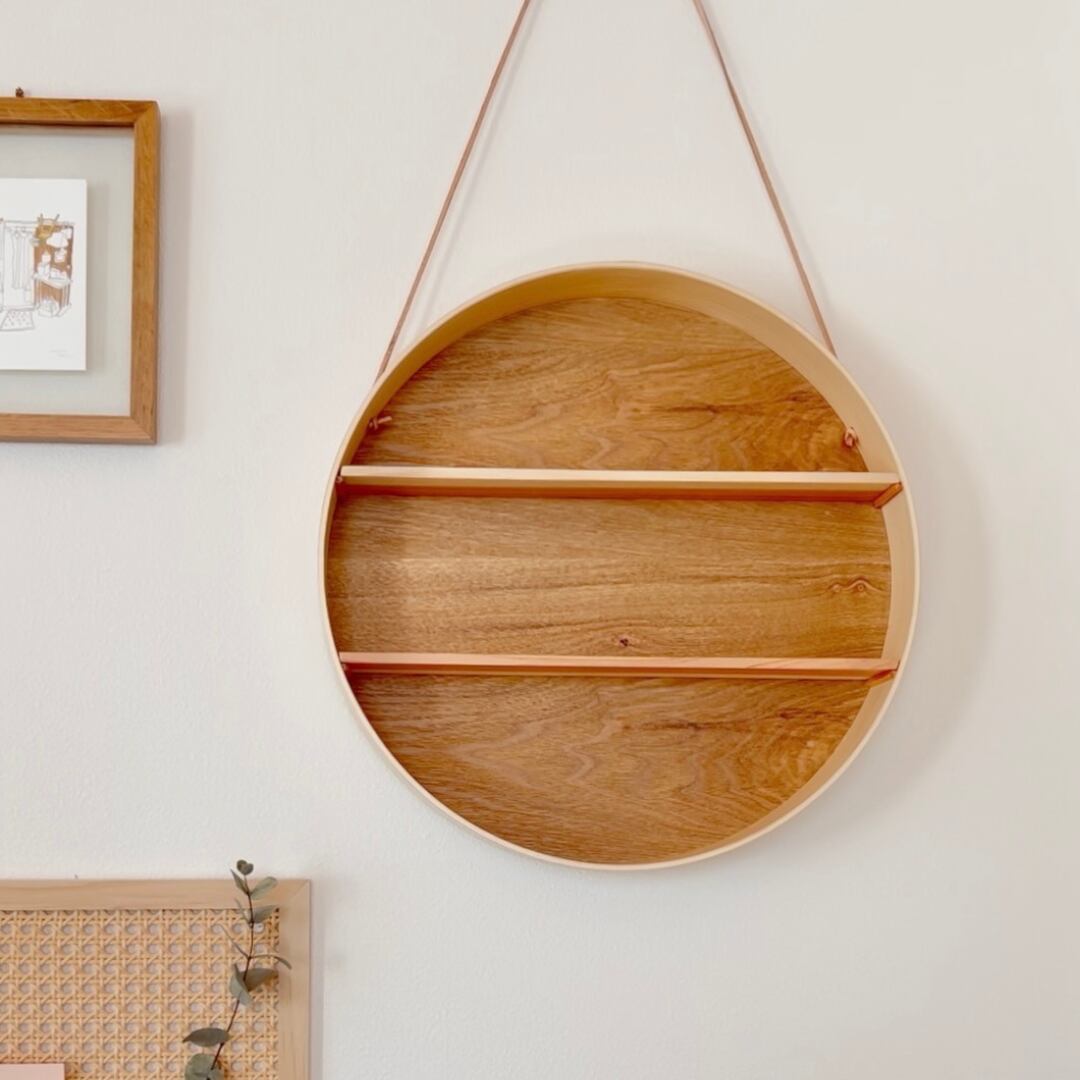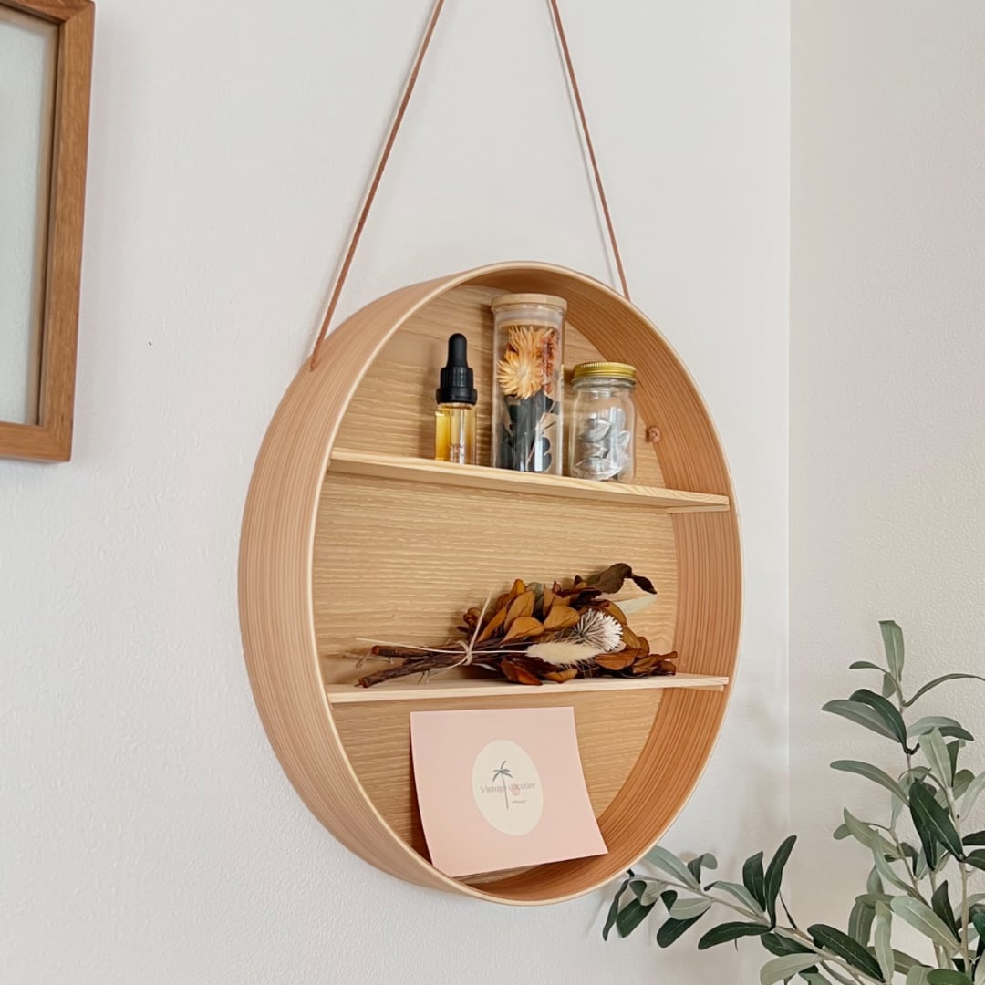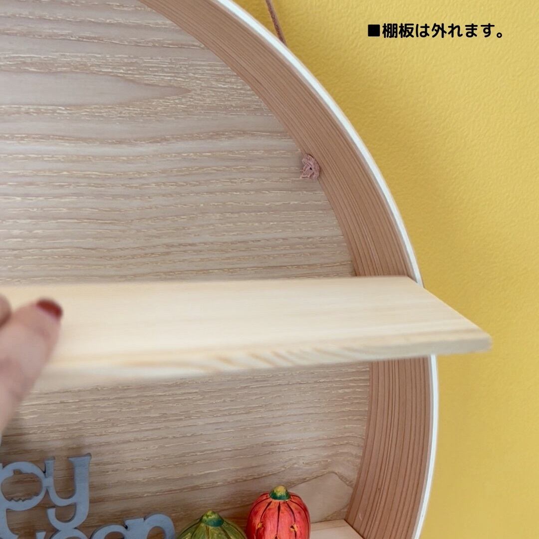 ■棚板が外れるため、DIYでリメイクシートなどを貼って楽しめる円形の飾り棚。素材は天然木で、1点1点人の手で作られたナチュラルな雰囲気が特徴です。